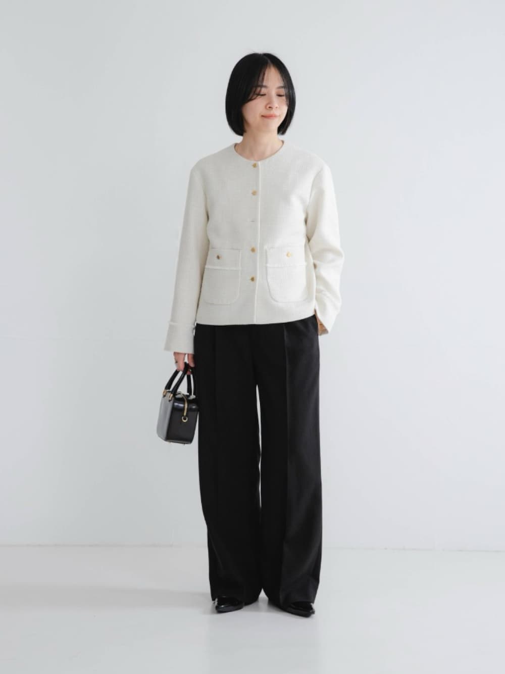 上品で軽やかな、着回し力抜群のツイードジャケット。 毎年ご好評をいただいている、ベストセラーアイテムのノーカラーツイードジャケットです。表面感のあるミックスツイード素材を使用し、大人の女性にふさわしい上品な雰囲気を演出します。 程よくコンパクトなサイズ感なので、どんなボトムスにもバランス良く着れるのが魅力です。インナーがもたつくことなくストレスフリーな着心地を実現。 高級感のあるツイード生地ですが、重さは気になりません。 単色なので派手すぎず、程よい華やかさがあり、長くご愛用いただけます。 微光沢のゴールド釦が、スタイリングに自然に馴染むアクセント。 ベルト付きオールインワンやブラウスにきれいめパンツを合わせたオケージョンシーンから、デイリーにデニムとTシャツを合わせたカジュアルスタイルまで、幅広い着こなしで活躍します。 シーズンレスでオンスタイルにも活躍。美シルエットスラックス。 ウールのような上品な風合いを持つ、ドライタッチな素材でお作りしたパンツです。ナチュラルなストレッチ感があり、シーズンレスでお使いいただけます。 軽くてシワになりにくいのも魅力です。 ご自宅で手洗いができるため、デイリーに気兼ねなく使えます。 ワンタックのストレートシルエットで、身体のラインを拾わず程よくすっきりとした印象に。丈は足の甲にかかるくらいのすっきりとした形に仕上げました。 後ろゴム仕様で、ストレスフリーな履き心地です。 ブラウスに同素材のノーカラージャケットを合わせた、まとまりのあるセットアップでの着用がおすすめです。もちろん、シンプルなニットやカジュアルなトップスとも好相性で、幅広い着回しが可能です。 ベーシックなカラーに加え、身長や体型に合わせて選べる3サイズをご用意しています。