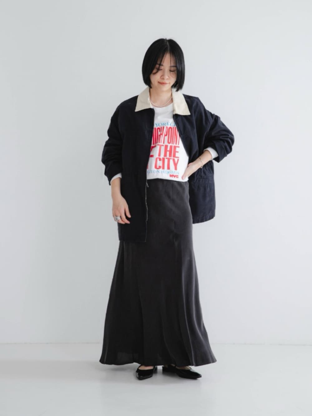 トレンド感のあるワークスタイルを上品に 着こなせる、ドロストカバーオール。 素材には、程よい張りと耐久性が魅力のコットンダックを使用しました。 ヴィンテージライクな加工を施すことで、身体に馴染むこなれた風合いに仕上げています。 配色の衿がワークテイストに洗練されたアクセントを加え、大人のカジュアルスタイルをクラスアップさせてくれる一着です。 すっきりとしたフロントジップとミニマルなポケットデザインにより、カジュアルながらも上品な印象に。ウエストの内側にはドローコードを配しており、絞ることでシルエットにメリハリが生まれ、女性らしいラインでの着こなしも楽しめます。 ボトムには、レーススカートやキュプラ素材のストレートスカートなど、女性らしいアイテムを合わせたミックスコーディネートがおすすめです。 季節の変わり目に重宝する、着回し力の高いライトアウターです。 存在感のあるロゴプリントが魅力の、GOOD ROCK SPEED別注カットソー。 コットン素材の柔らかな肌触りが、デイリー使いにぴったりです。 NYCのロゴを使用した別注アイテムで、フロントの程よい存在感のあるプリントが、一枚で着こなしの主役になります。 ゆったりとしたシルエットで着心地も抜群。ジャケットやトレンチコートのインナーとしても合わせやすく、季節を問わずロングシーズン活躍する万能アイテムです。 一枚で着る際は、裾をインするとバランス良く決まります。 ゆったりと裾を出して着る場合は、ビスチェなどをプラスすると、トレンド感のある着こなしが完成します。