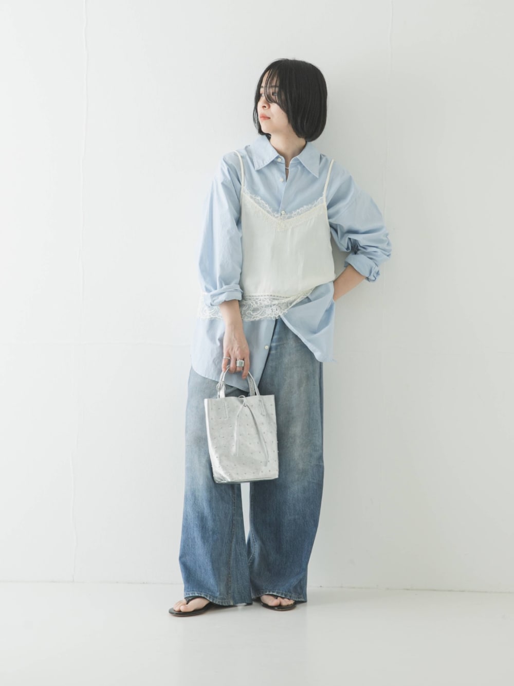 ヴィンテージライクなレースが目を惹く、サテンレースキャミソール。 表面にシボ感のあるポリエステルサテンを使用し、胸元と裾に繊細なリバーレースを施すことで、ヴィンテージランジェリーのような趣のある雰囲気に仕上げました。 トレンドムードを感じさせながらも、大人の女性にふさわしい上質なニュアンスを演出してくれる一着です。 一枚でのインナー使いはもちろん、Tシャツやシャツとのレイヤードもおすすめ。 いつものスタイリングに取り入れるだけで、ぐっと鮮度の高い着こなしが叶います。 肩紐にはアジャスターが付いているため、合わせるインナーや体型に合わせて長さを調節できるのも嬉しいポイントです。 リブカットソーやシアー素材のトップスに重ね、ボトムスはスラックスやデニムを合わせてシンプルなスタイルのアクセントに。足元にきれいめなフラットシューズを添えれば、フェミニンとカジュアルが絶妙に調和した大人のミックスコーディネートが完成します。