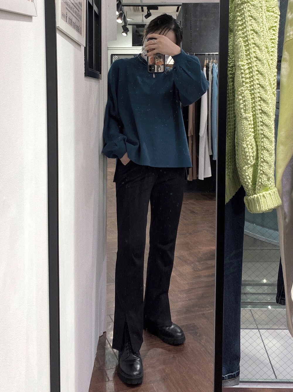 . 右手ポッケに入れがち🤣 . フロントスリットパンツ、ストレッチ効いててめっちゃ履きやすいから愛用中です🥰 . 今年の冬は、色物が流行りそうですね♡