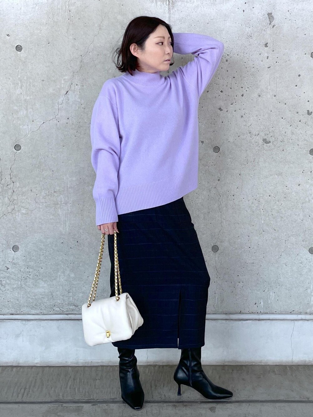 MAKIのブーツ「【雑誌掲載】スクエアトゥストレッチショートブーツ」を使ったコーディネート