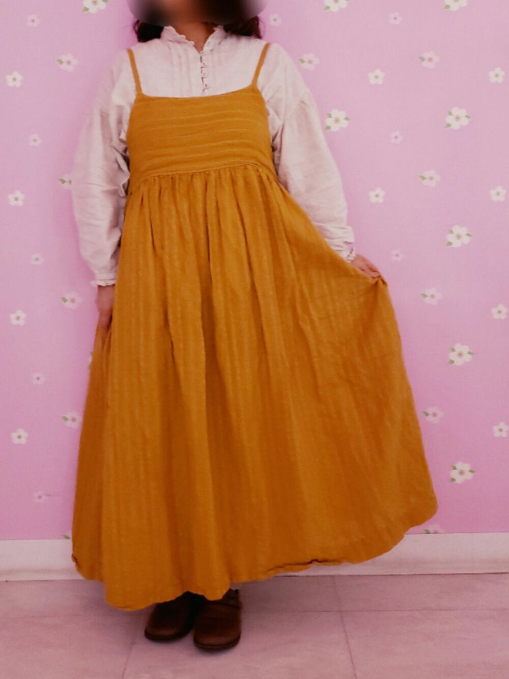 休日コーデ マスタード色のキャミワンピースは気に入りすぎて色ち買いしました。ステッチ刺繍が可愛い生地です。丈が長すぎるのですが、そのまま着ています。ブラウスはSamansaMos2の去年大人気だったブラウスです。