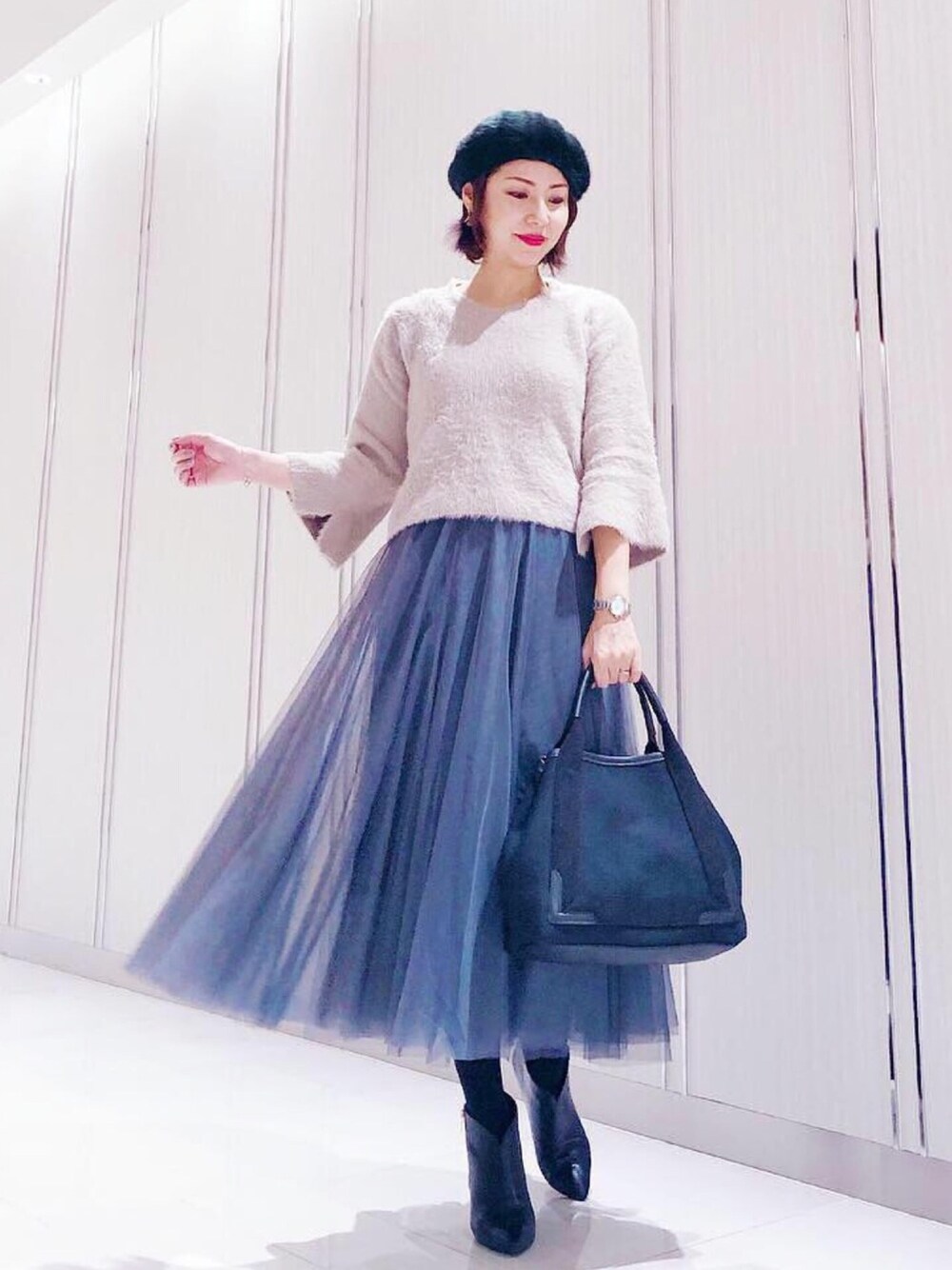久しぶりのコーデ写真☺︎ ニット × チュールスカート 素材で優しい感じになるのが好き☺️ 寒くて冬眠したい病🤧😴🐿☁️