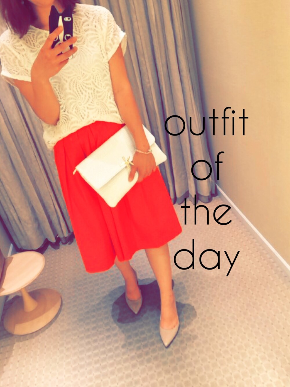 やっと届いたクラッチを使いたくて。女子会コーデ♡ 気分あげたくて赤いスカート履きたかった。GUで1400円くらいだった激安アイテム♡