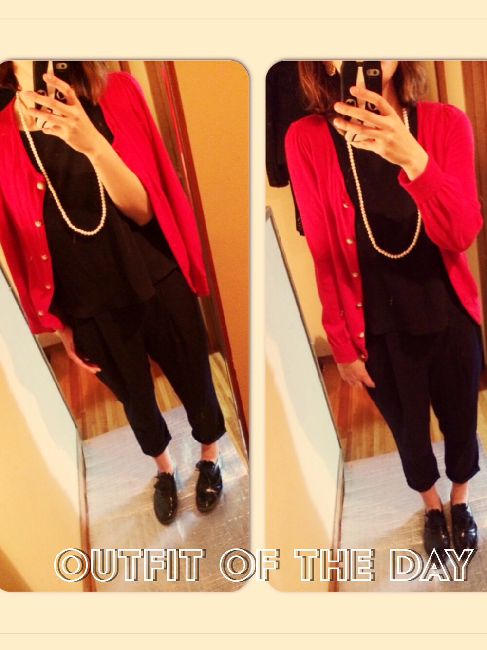 赤いカーデは使えるー。 お気に入りのネイビーのサロペットに差し色♡ 店員さんにカーデを袖通さずに肩掛けを提案されたけど、おしゃれぶる自分が恥ずかしい。 袖通しや!ってわたしならなるもん。