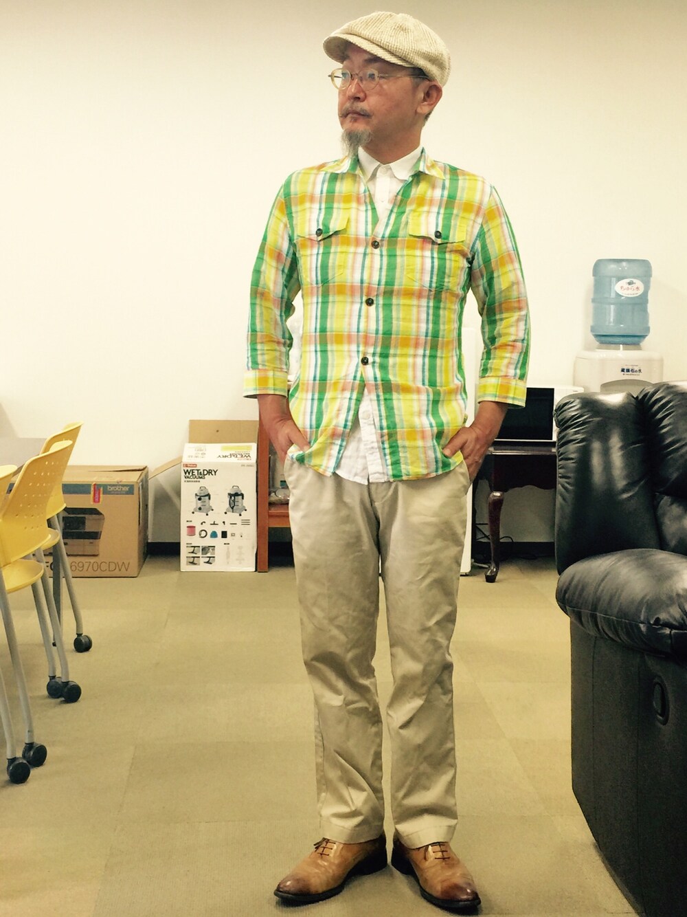 これまたど定番のチェックシャツ&チノパンコーデ。 フトゥは全開けしたりして、で中にタンクトップとかてろ〜んとしたVとか着て、首輪とかグラサンとか胸元に飾って足元はスニーカー、でしょうけどジェントルマンで、ってーと白シャツをキッチリ第一ボタンまで、に成りやすw f^_^;