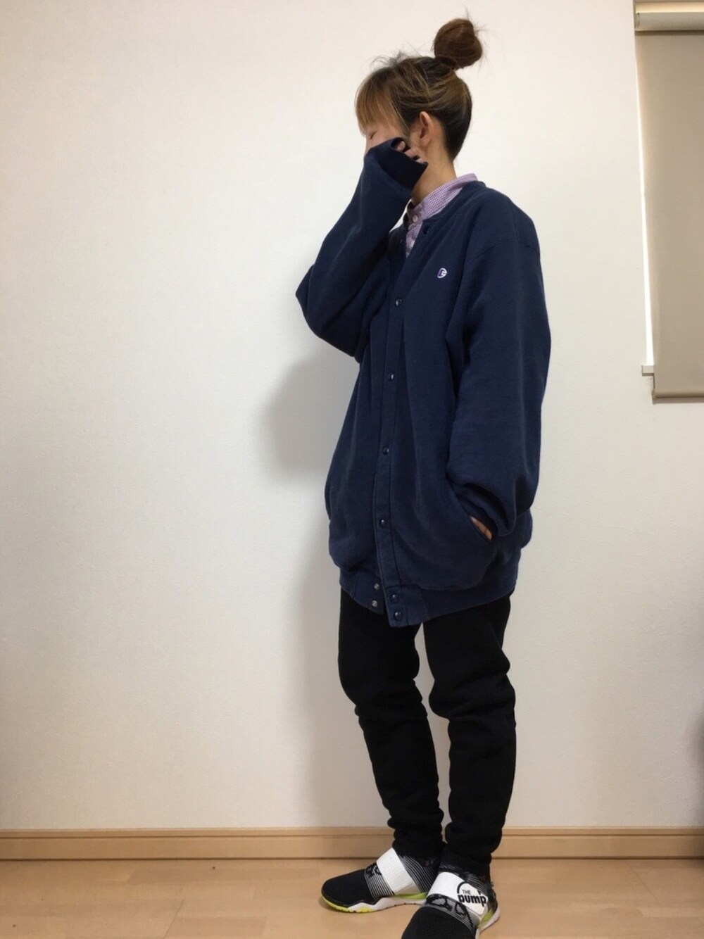 チャンピオンのスナップボタンスウェット のボタン留めてみました😊 チラッと見えるシャツもかわゆす😍