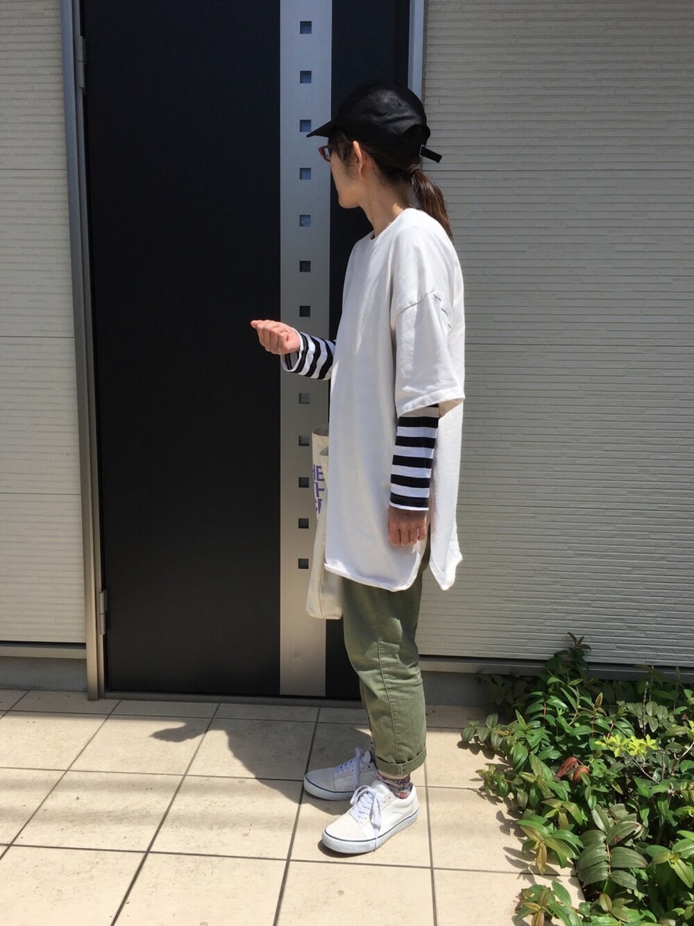 アースカラーコーデ😊 GUのオーバーサイズTの裾クルンが気になるけど気にしないようにしている(笑) ボーダーT⇒無印良品
