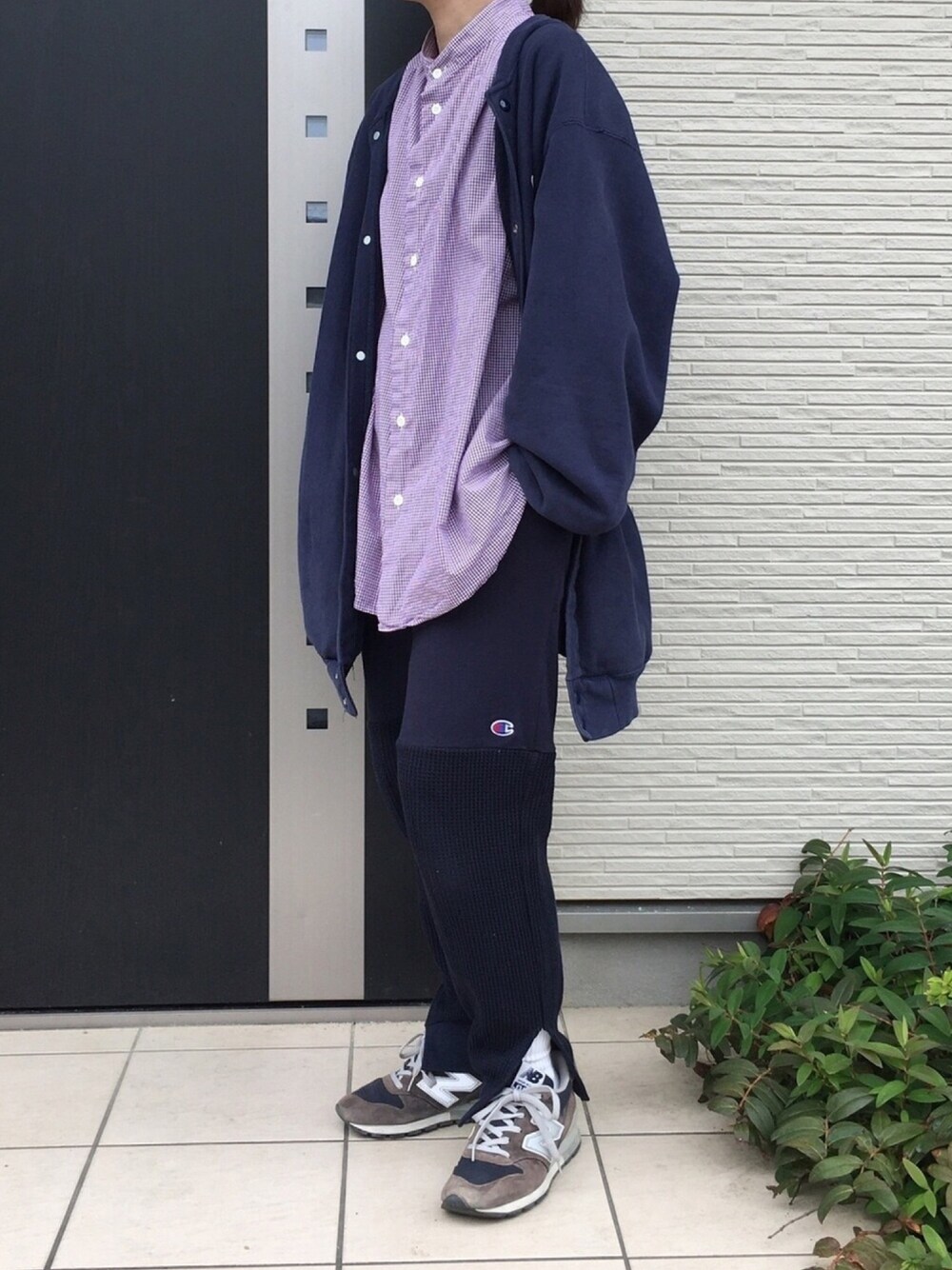 ここ最近はネイビーがお気に入り😊 スナップボタンスウェット☆古着 ドッキングパンツ☆otii
