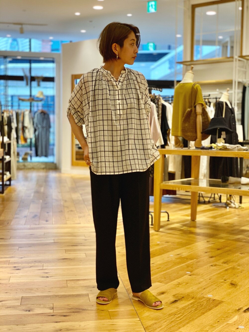 ふんわりとした透け感のあるチェックブラウスに、形の綺麗なイージーパンツで合わせました。 爽やなブラウスなのでナチュラルすぎず、リラックスした着心地の一着になっています。