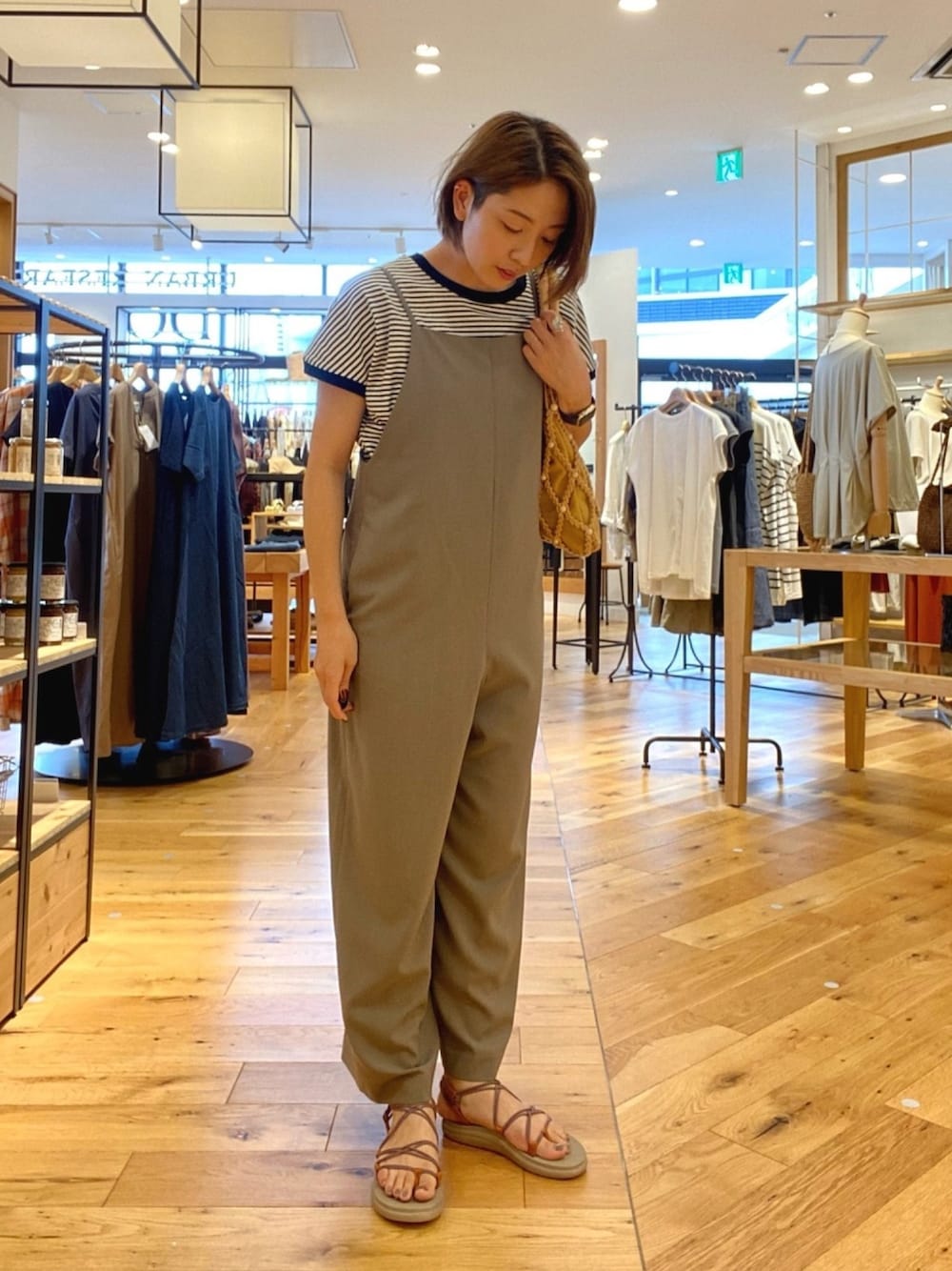 大人っぽいサロペットに細ボーダーのTシャツをあわせました。 さらりとした着心地のボーダーTは袖の長さが絶妙なのでおすすめです◎