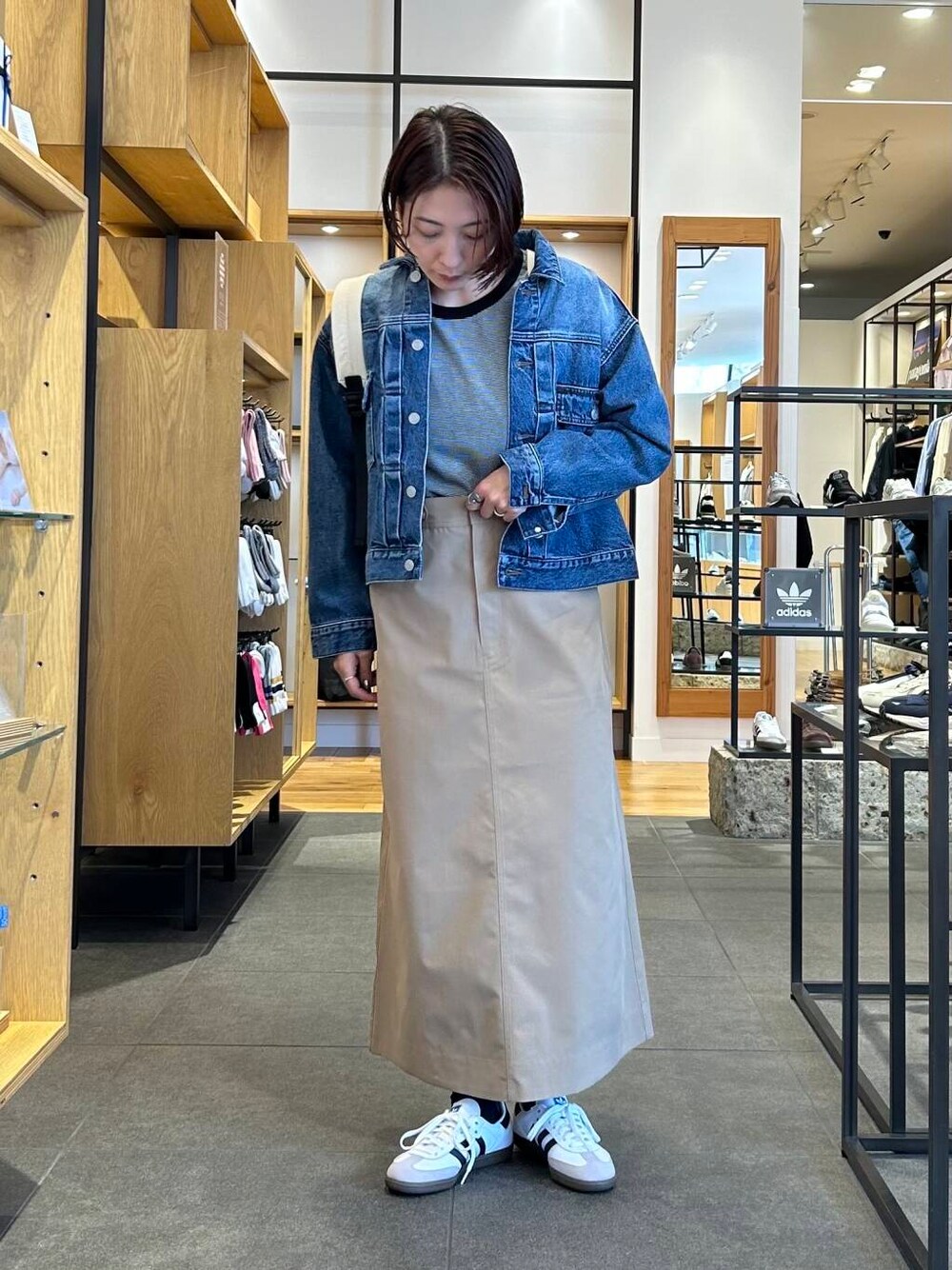 ご覧頂きありがとうございます! サスペンダートラペーズスカートにボーダーとデニムジャケットでラフに合わせてみました🐼◎ サスペンダーの色がスカートの色によって違うのでどちらも悩みどころ……🤔🩷 オールシーズン着回し出来そうなアイテムです🫶 是非店頭でご試着してみてください🌼