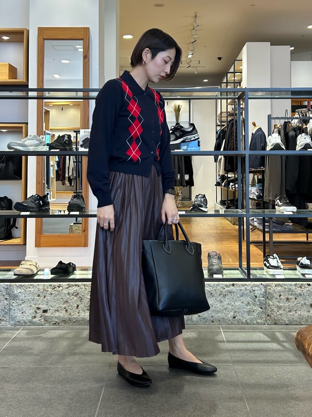 ご覧いただきありがとうございます。 URBAN RESEARCHのチンツプリーツスカートのツヤ感とニットの組み合わせが可愛いです◎ 丈感も幅広い身長の方に合う長さでこれからの季節はブーツを履いても可愛いですね🙆♀️ アーガイル柄のシャツカーディガンは今が旬✨ アーガイル柄が素敵です。 是非店頭でお試しください✨