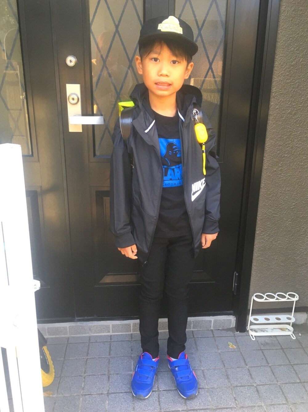 学校コーデ🏫 今日は全身ブラック🦍 指定の校帽がないので帽子は自由🗽 1年生のランドセルカバーが ネオンイエローという事で😆 学校コーデもたまに載せて行こうかな。。 見ていただきありがとうございます😊