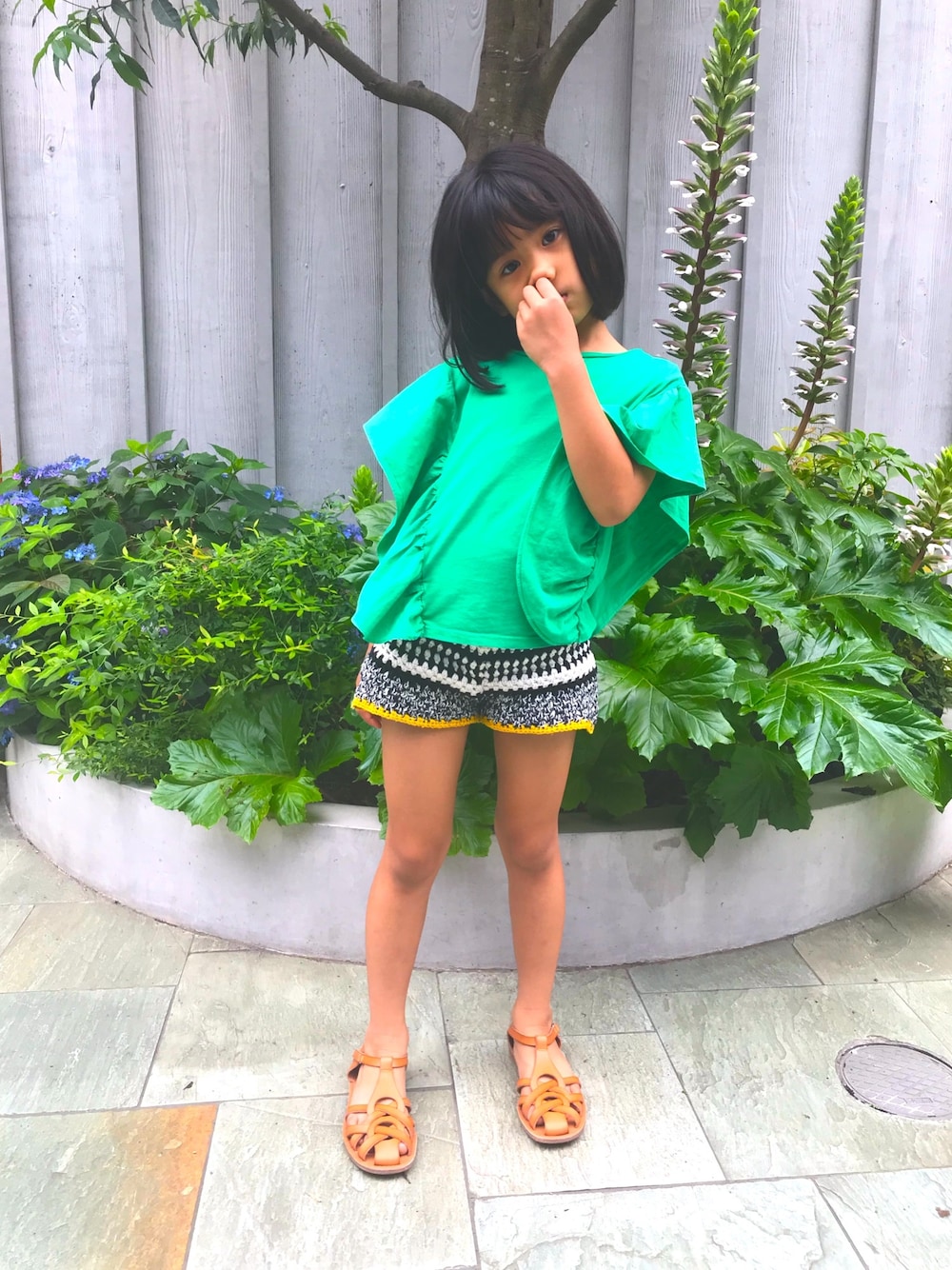 グリーン系のTシャツ/カットソー、ブラック系のパンツ、ブラウン系のサンダルを着用したキッズの春コーディネートの1枚目の写真