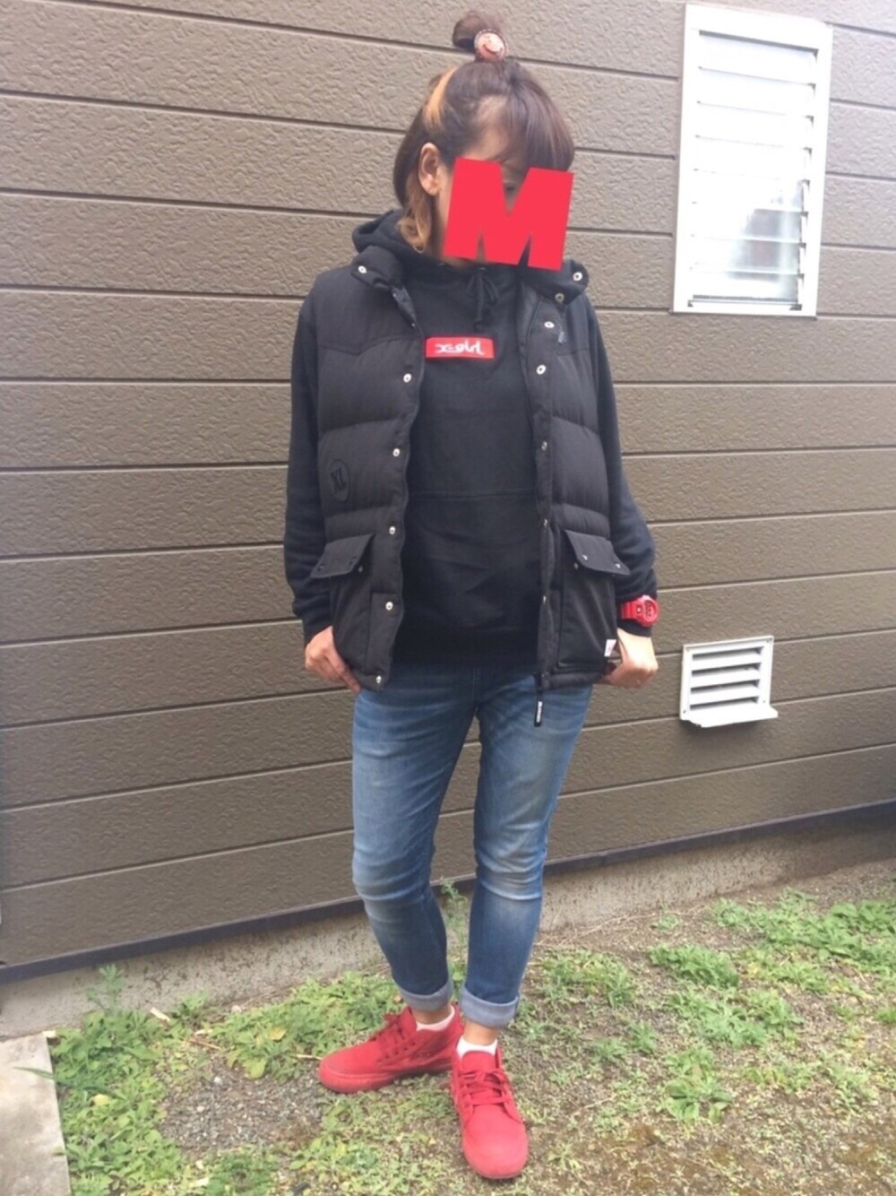 赤ポイントコーデ❤️ 夫にファミセで買ったダウンベストを 拝借😆ダウンだからあったかい🔥 相変わらずマタニティデニム履いとります🤰