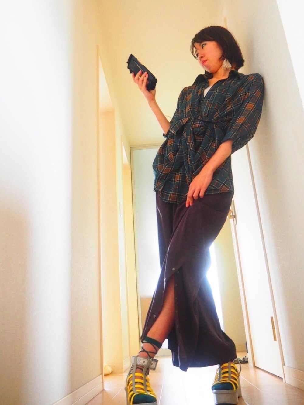 こんばんは🌙 ブラウスを前で緩く一つ結び🍀 雰囲気が変わって楽しいです😊