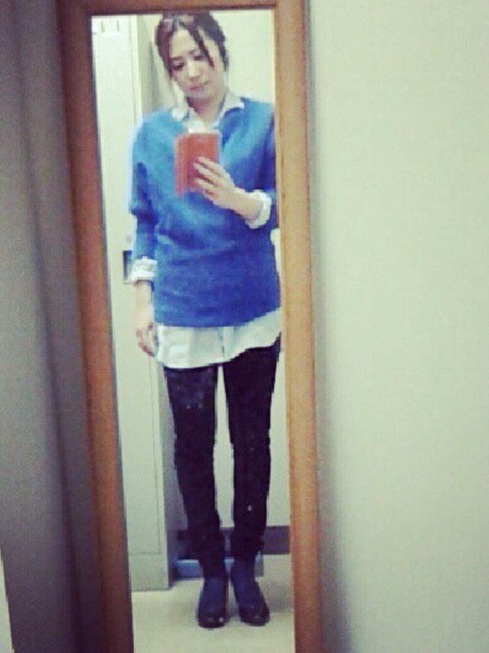 ブルー系のシャツ/ブラウスを着用したレディースの冬コーディネートの1枚目の写真