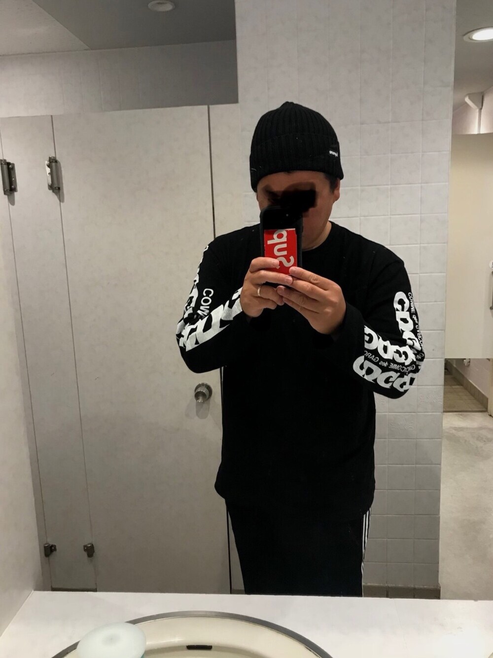 久々買い物オールブラックスタイル。 ギャルソンのロンT卸しました(^ ^) トラックパンツにサイドデカロゴカットソーは会いますね(^ ^) この時期でも今日は寒いからビーニー被って(^ ^)
