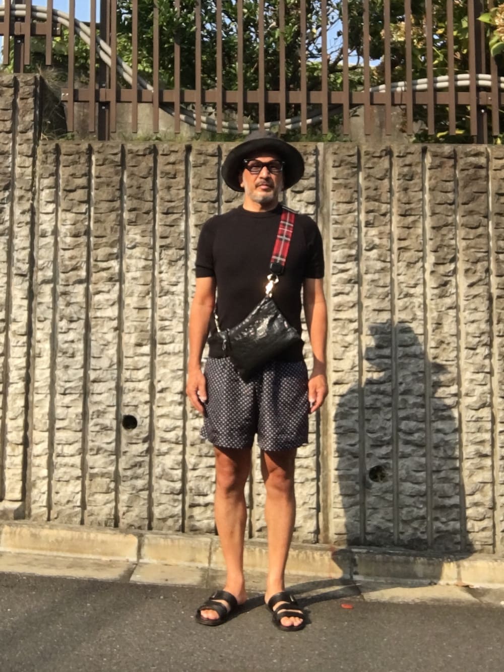 ひとつ前のコーデとほぼ同じ、色違いバージョン。ハットとTシャツを白から黒にしてみました。同じアイテムでもぜんぜん違うムードになります。今回はパンツの位置も少し上にしてみましたよ。