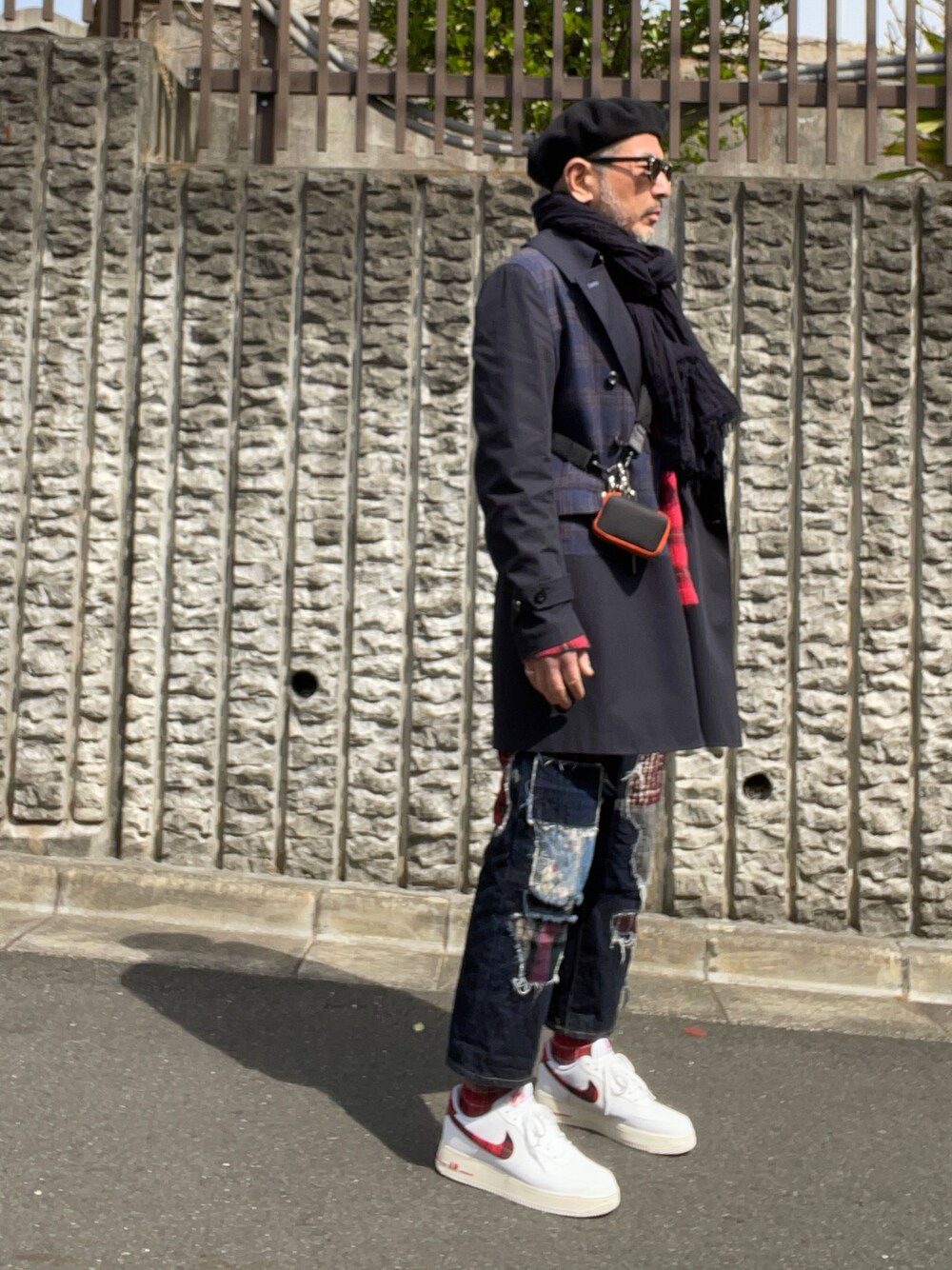 チェック。ショートトレンチはじめデニム、ソックス、中に着たカットソーまでぜんぶチェック入りのアイテムでまとめました。コートのムードが上品なので、これだけ派手にしてもうるさすぎず全体として落ち着いた雰囲気に収まっていると思います。
