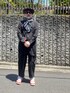 ブランドバラバラ。ハット、サングラス、スカーフ、ロングシャツ、ワイドパンツ、スニーカー。ぜんぶちがうブランドだけど、なんとなくまとまってる感じ?そしてスニーカーの中、ソックスがしれっとドットでスカーフとコーデされてるというね。