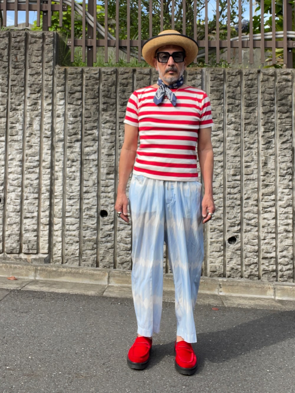 むむ。さすがにちょっと太りすぎました。おじさんなんだから、まあおじさん体型でいいんですけど、こうやって写真に撮ってみると自分で見て痛たましい気持ちにさせられます。ダイエットします。 しかし悪いのは自分で服には何の罪もない。上下同ブランド。シーズンは違うけどやはりしっくりくる感じがします。トップスのピッタリ感もサイズ的には悪くない。問題は自分の体型だけね。