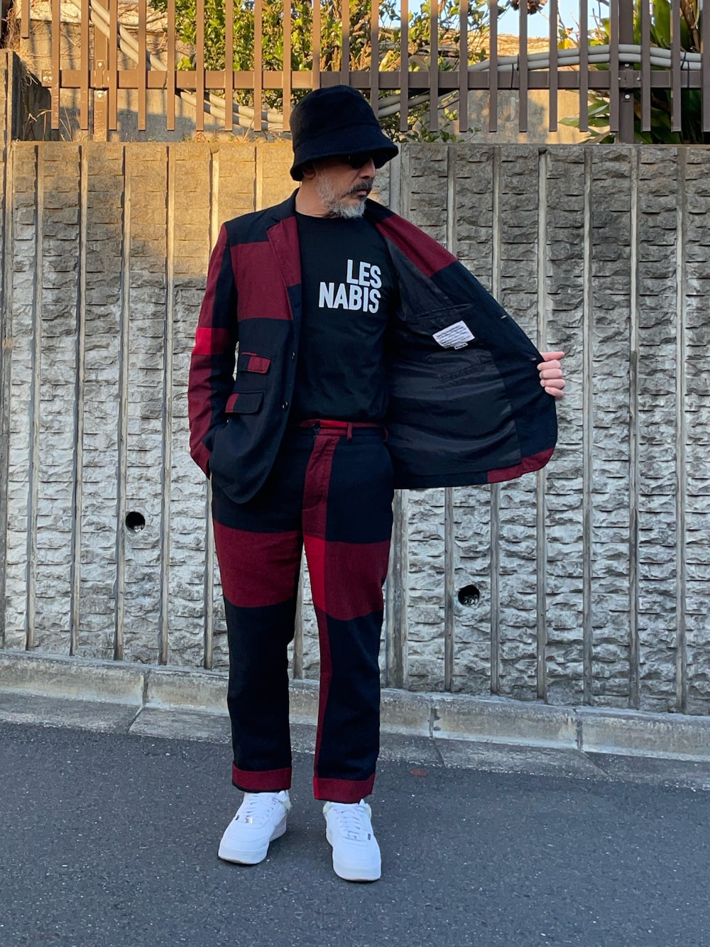 オリジナルロンT。日中、妙に暖かい日が続き、ジャケットの下はTシャツでじゅうぶんな感じ。白文字だけのオリジナルTが、なかなかのインパクトを醸していると思います。文字が胸元からチラッと見える感じが上級。同じものを購入できますので、興味ある方はサイト覗いてみて下さい。D STORE MACROMANCEとググると出てくるはず。 ガーメンツ の定番バケットハットは適正サイズが手に入らないのが難点で、今回ようやくSサイズを入手。いつもMサイズで中に詰め物してかぶっています。Sでもまだ大きいのですけど、ブランドの方針だからしょうがないかな。チビ、痩せのことも考えてもらえるとありがたい。EGのチームに声が届きますように。サイズ感以外はほぼ完璧なブランドと思います。