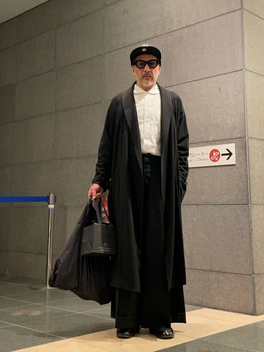 ボトムは今期のコムデギャルソン、袴みたいなシルエットのワイドパンツはレディースで見つけました。羽織ったガウンもオーバーサイズ。中は白シャツ。ストールもアクセサリーも何もなし、シンプルすぎるぐらいシンプルなコーデです。