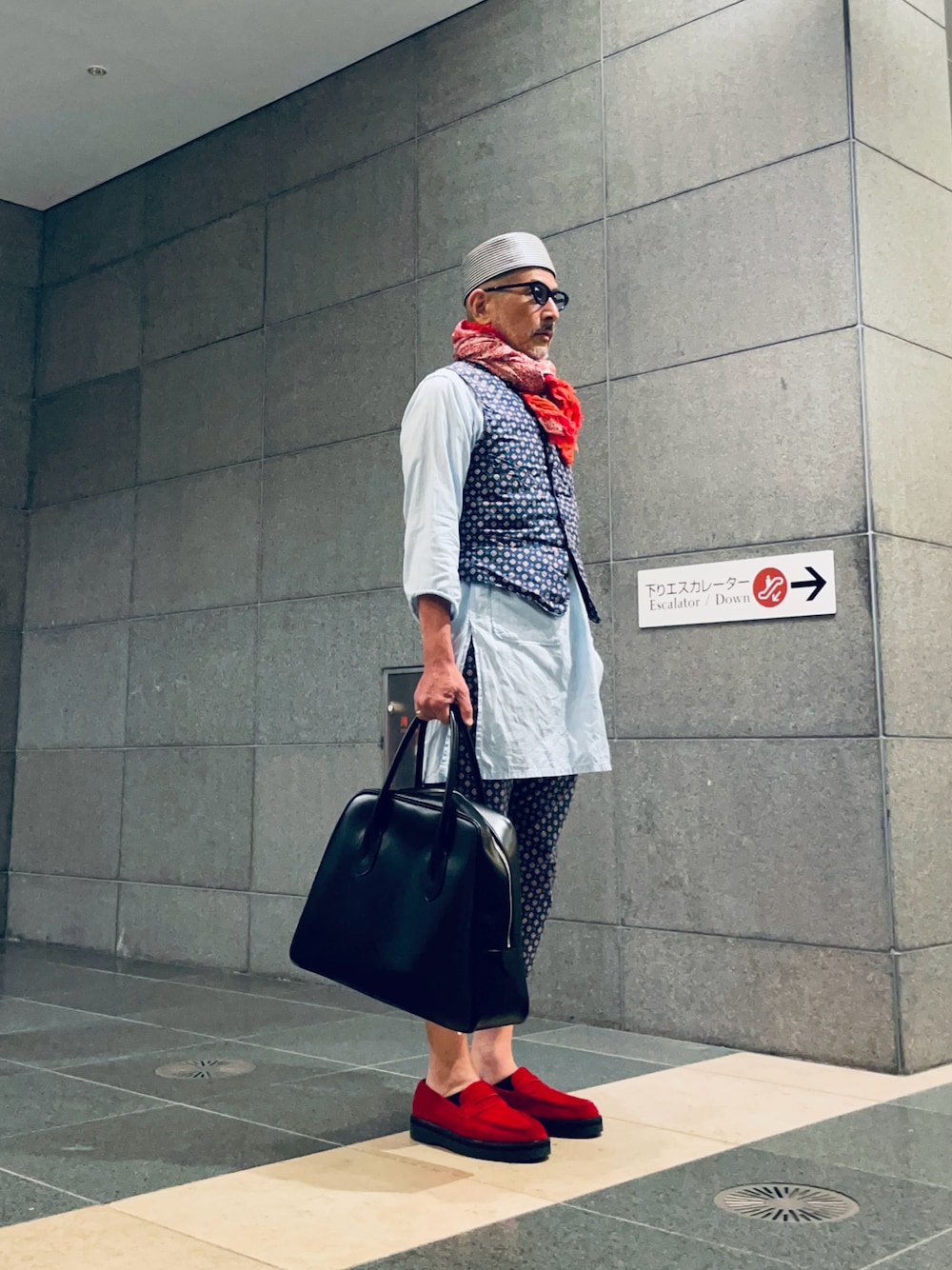 いい感じのつばなし帽を入手したので、アラブ、アフリカ調のコーデでまとめてみました。どことなく茶人を連想させるシルエットの帽子ですので、和風というか板前さんみたいに見えてしまうところが難しい。 今回も帽子とバッグ以外はほぼ10年以上前に買ったアイテムばかり。新しい服も買ってないわけじゃないんですけどね。オール新品、なコーデを披露する機会がなかなかありません。 六本木ヒルズのトイレで用を足してたら、となりのはくじの方に「ナイスシューズ!」と、声をかけられました。笑