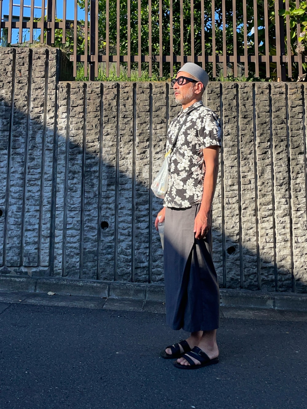 で、買ったばかりで既にお気に入りのつばなし帽子と夏定番タイパンツ、一枚しか持ってないアロハ風シャツ&レザーサンダルでコーデしてみました。どこの国だかわかんないけどエスニックな仕上がりになりました。今回も帽子以外は全て10年以上前に買ったアイテムばかり。
