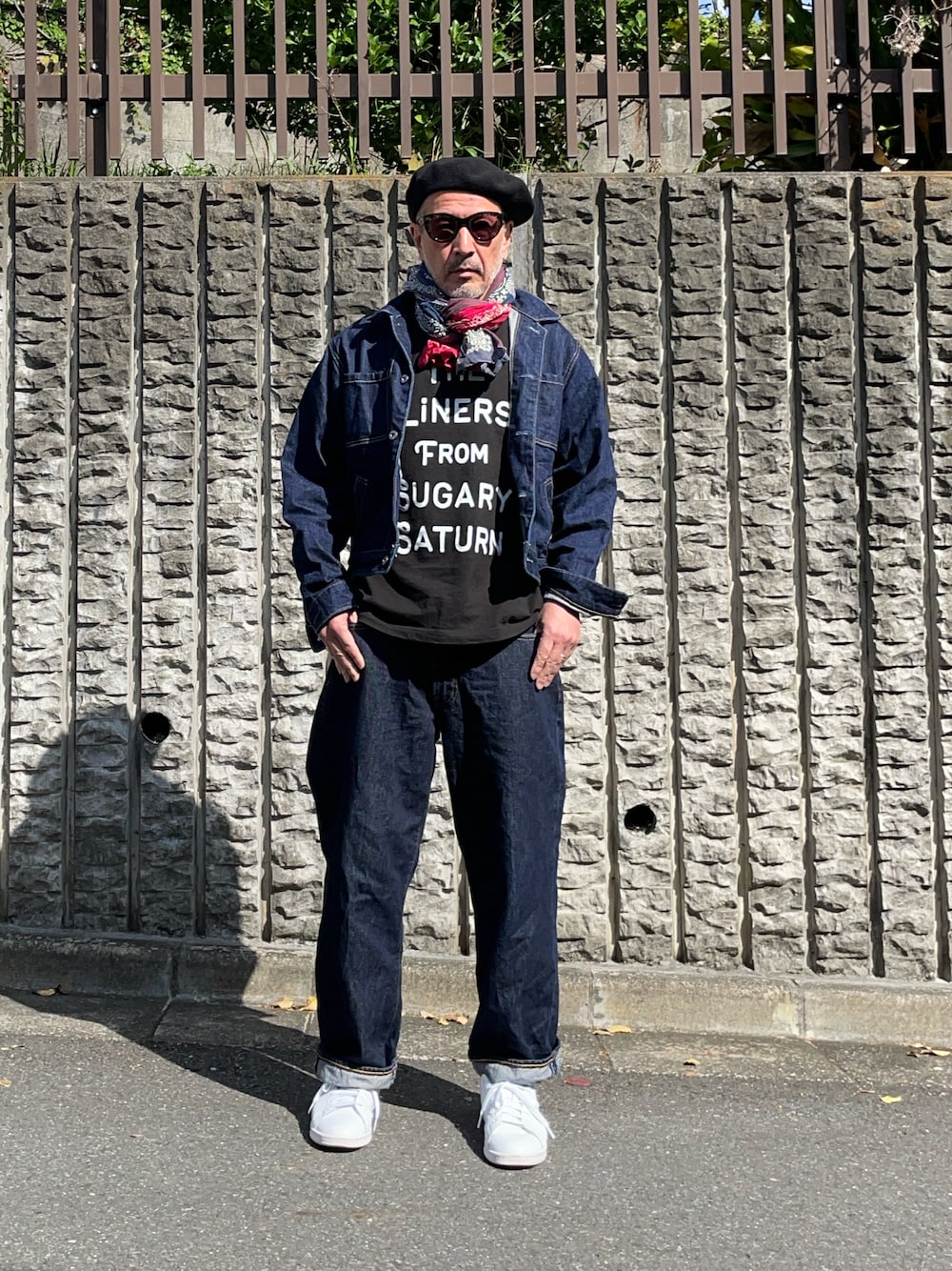 急に寒くなり、ベレー帽登場。アメカジアイテムの代表格=デニム上下もベレーに合わせるとちょっとヨーロッパ風?中に来たTシャツは今度ライブで参加するバンドのオリジナルです。