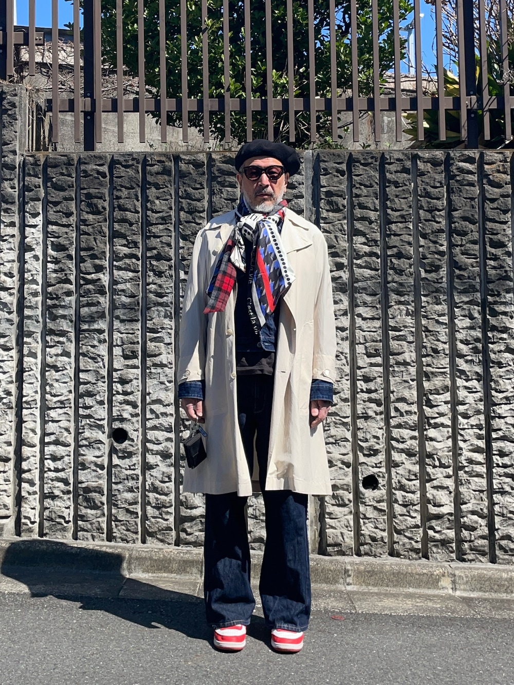 春コートの出番。実は活躍する期間がとても短い。近年はいきなり夏がくるんでね。首元はヴィンテージのスカーフとウールのマフラーをドッキングさせたリメイク品。世界にこれしかないという特別感でアガります。