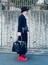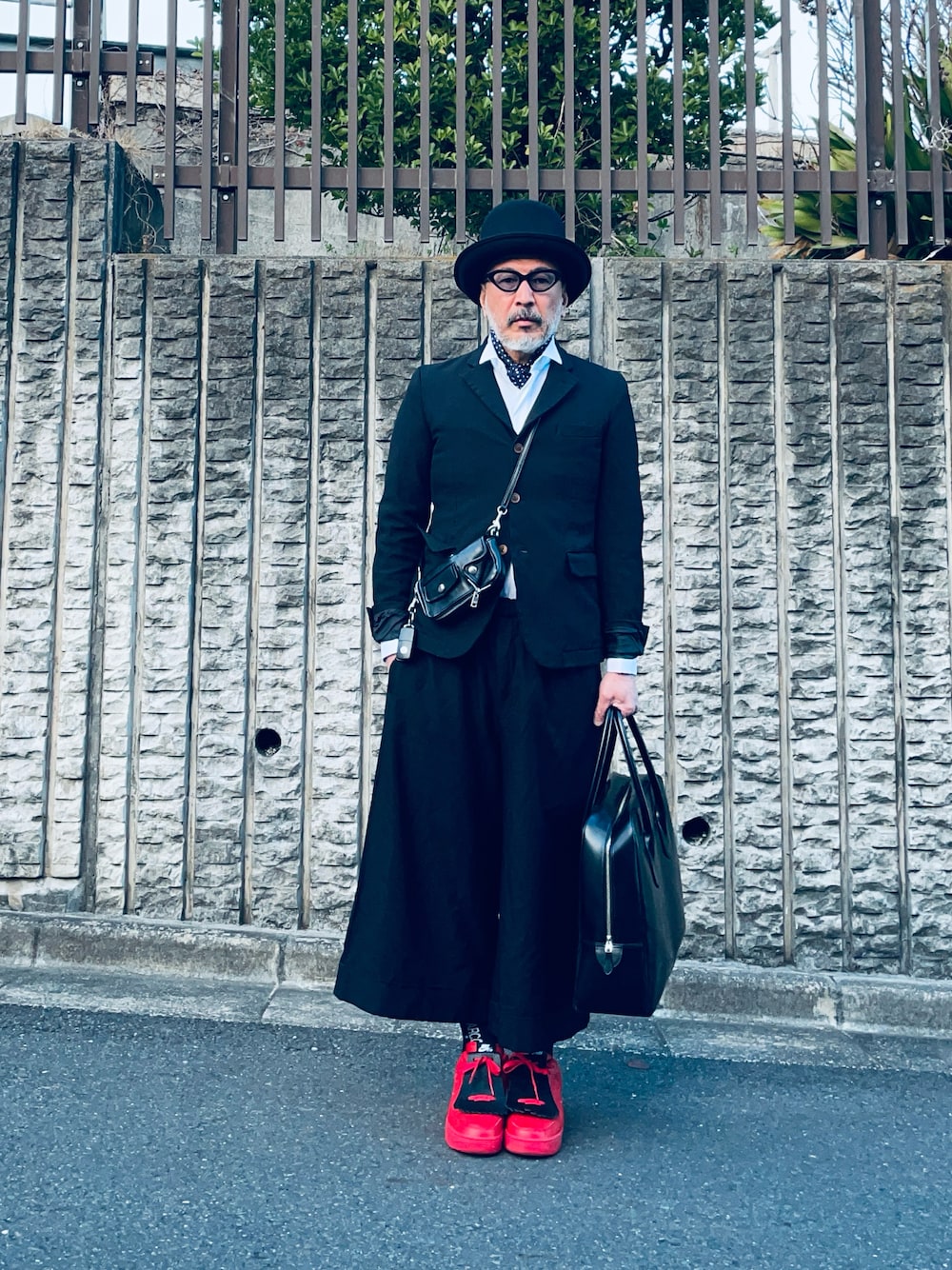 だいたいコムデギャルソン でまとめました。ボトムはスカートっぽいシルエットだけどクロップドのワイドパンツ。上下共に素材はポリエステル。バッグふたつ持ちはルール違反?