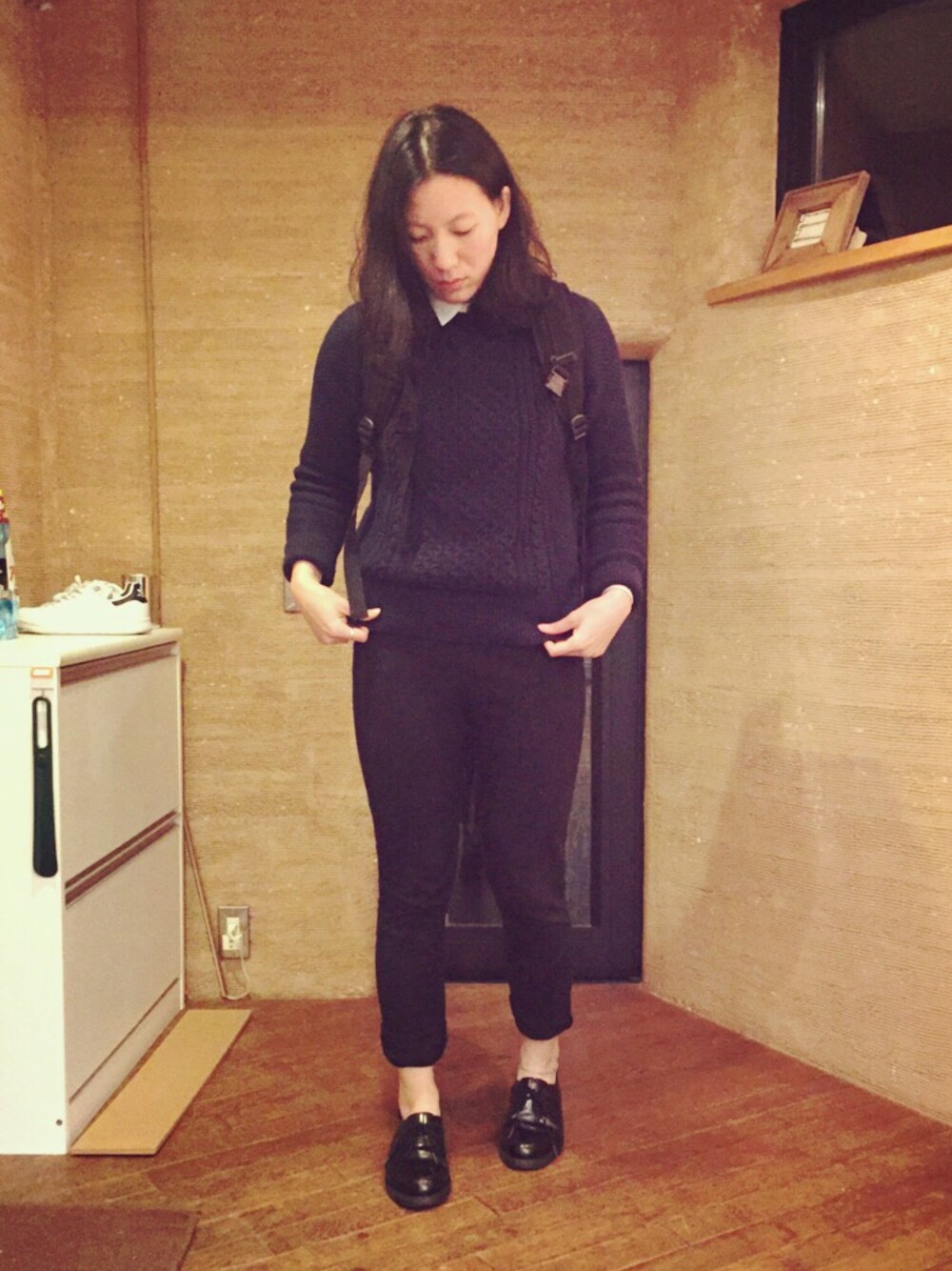帰宅。安定の仕事着。