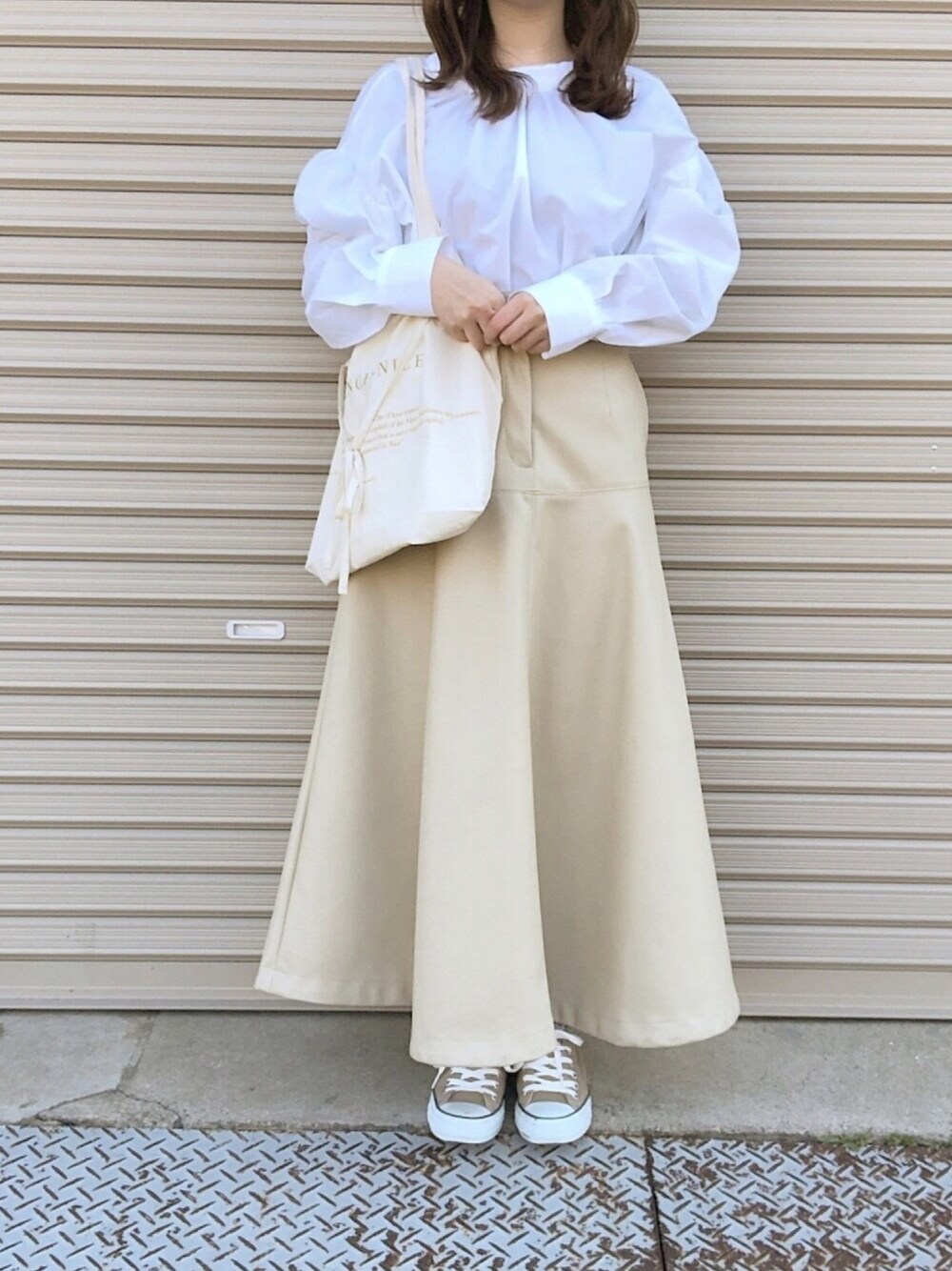 ほうじちゃらてのスカート「フェイクレザーフレアスカート」を使ったコーディネート