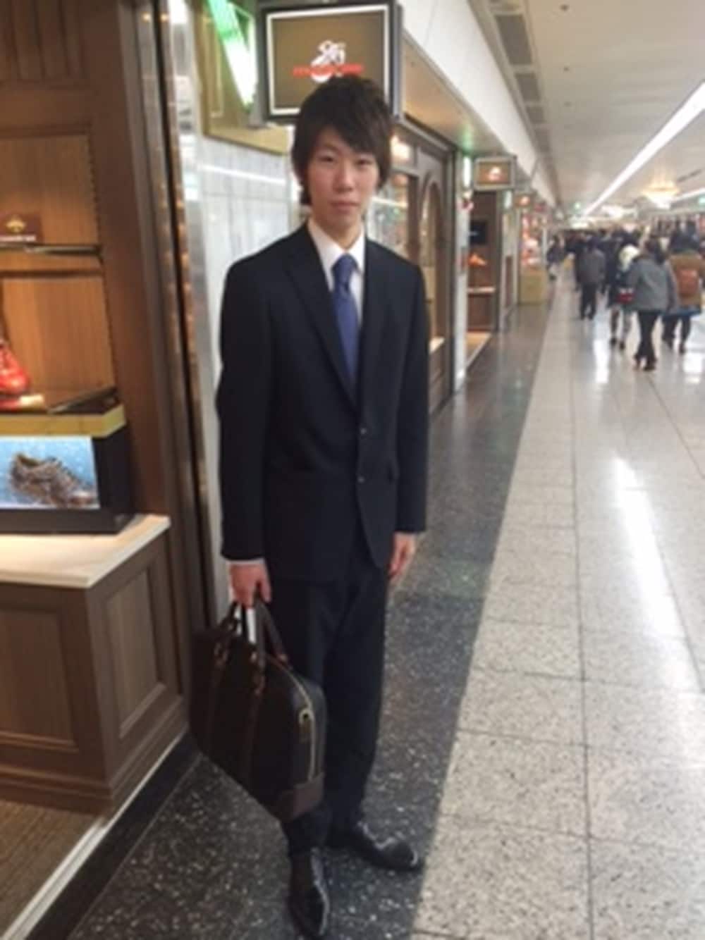 黒のストレートチップを爽やかなスーツスタイルに合わせてみました。 ネクタイをブルー系でまとめたことで、フレッシャーズらしい好感度の高いスタイルに♪ つま先も適度なラウンド型で、アッパーには柔らかいイタリアンカーフを使用。 シンプルだからこそシルエットや素材にこだわりたいという方にもオススメです。