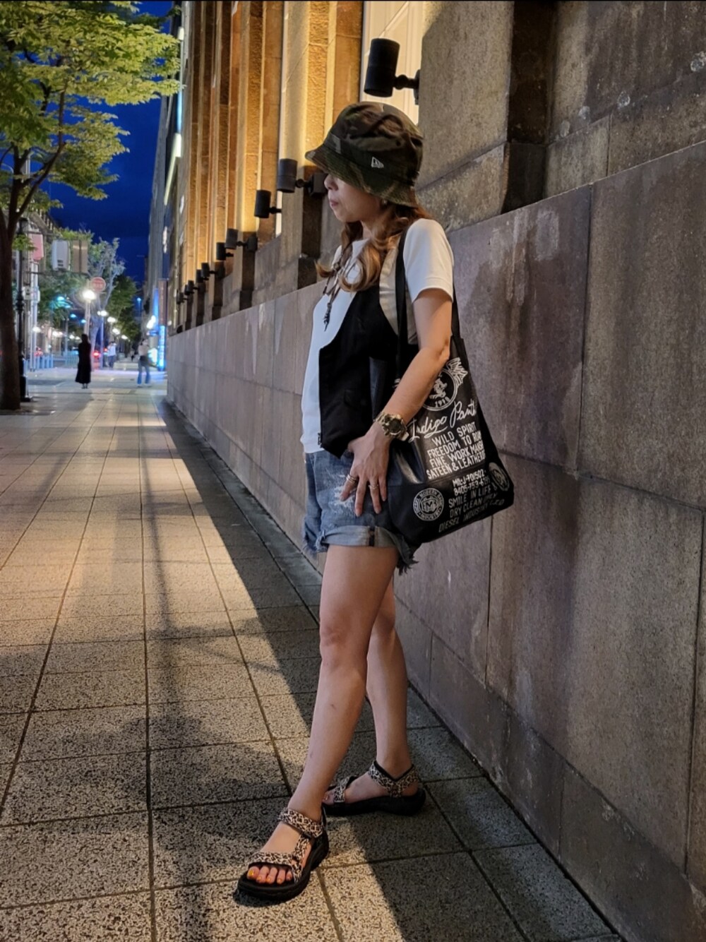 昨日のコーデ 買ったばかりの バケットハット被った ピッタリでお気に入り 活躍しそう♥️ 白Tはユニクロが 一番好き~♥️ あとはかなり 昔に買った服ばかり 活躍中😂