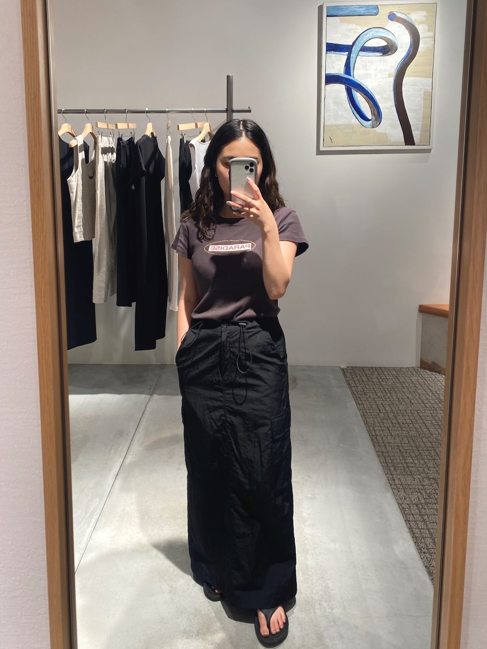 コンパクトなTシャツとナイロンスカートの組み合わせは、女っぽさも出せるのでスキ👍🏽🤍
