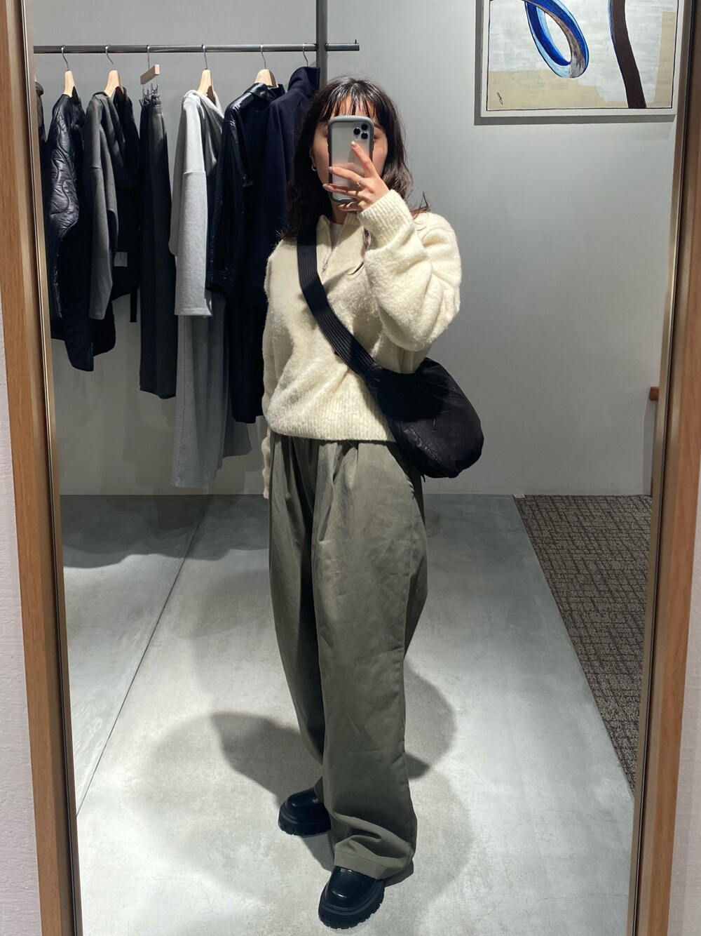 ニット着れる季節嬉しい〜🧶☺️ パンツはユニセックスですが、ブーツを合わせると低身長でも履けちゃいます♡