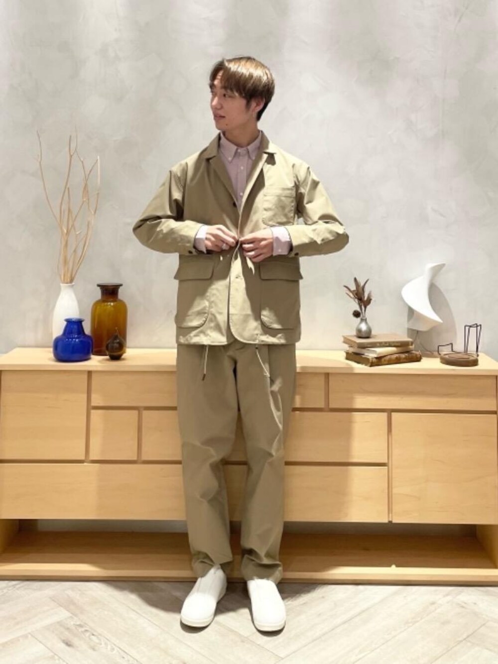 [モデル] 180cm 65kg 20代後半 [普段着用サイズ] トップス:L,XL ボトムス:M,L シューズ:27.0-28.0cm [サイズ感] シャツ:標準 Lサイズ着用 ジャケット:ややゆったり Mサイズ着用 ボトムス:ややゆったり Lサイズ着用 シューズ:標準 28.0センチ [コーディネートポイント] 春カラーでまとめたセットアップコーデです。 ベージュ×ピンクで爽やかな雰囲気にまとめました。