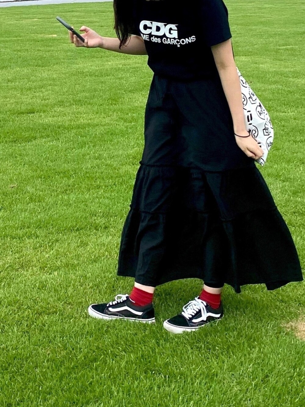 CDGシャツにロングスカートをあわせました。 女の子すぎない男の子すぎない韓国っぽいファッションを気がけてる(語彙力… kbpの巾着バッグお気に入り👍🤎 片手にスマホ📱