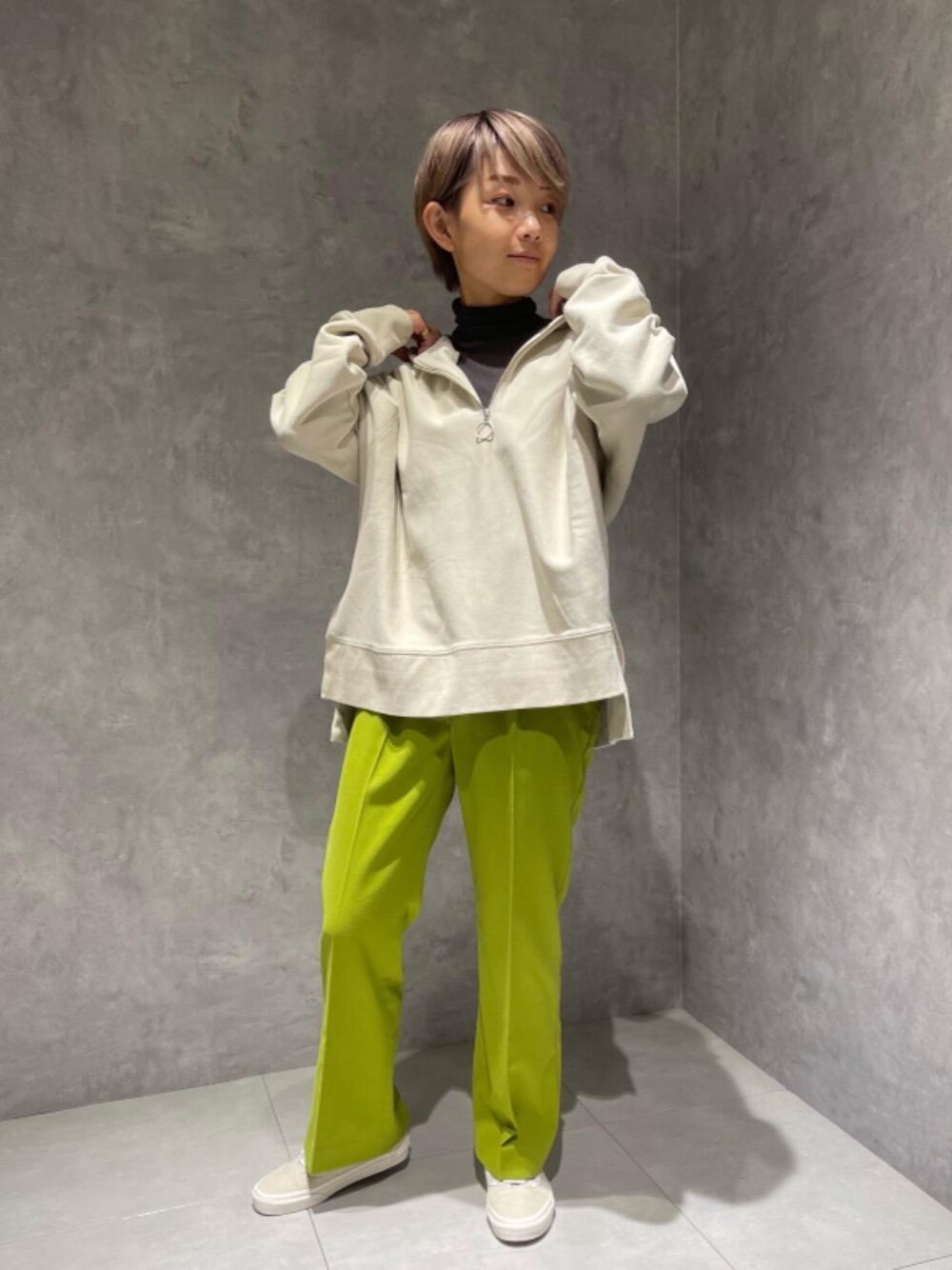 身長152cm 普段サイズ ボトムス34/シューズ22.5cm 【サイズ感】 トップス:ゆったりめ ボトムス:標準的 シューズ:標準的 【素材感】 ボトムス:さらっとした着心地 【コーディネートポイント】 ジッププルオーバーがゆったりめな分、鮮やかなカラーパンツを合わせてスタイリングにメリハリを。胸元のファスナーは全開で敢えて中のインナーを覗かせるのもオススメです。
