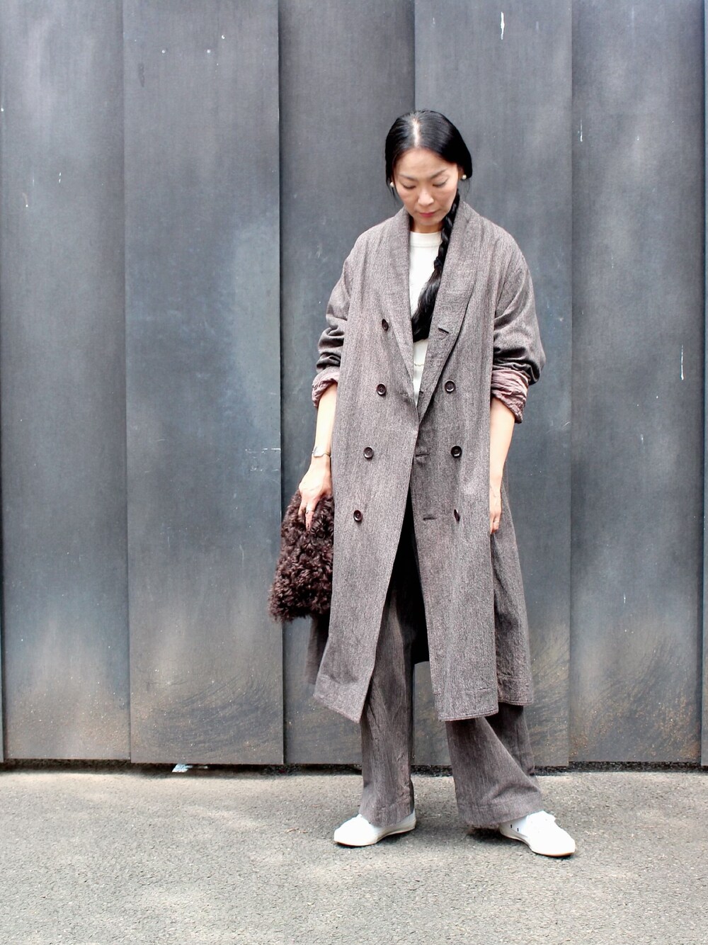 新作、コットンカルゼツイードのコート とワイドパンツ