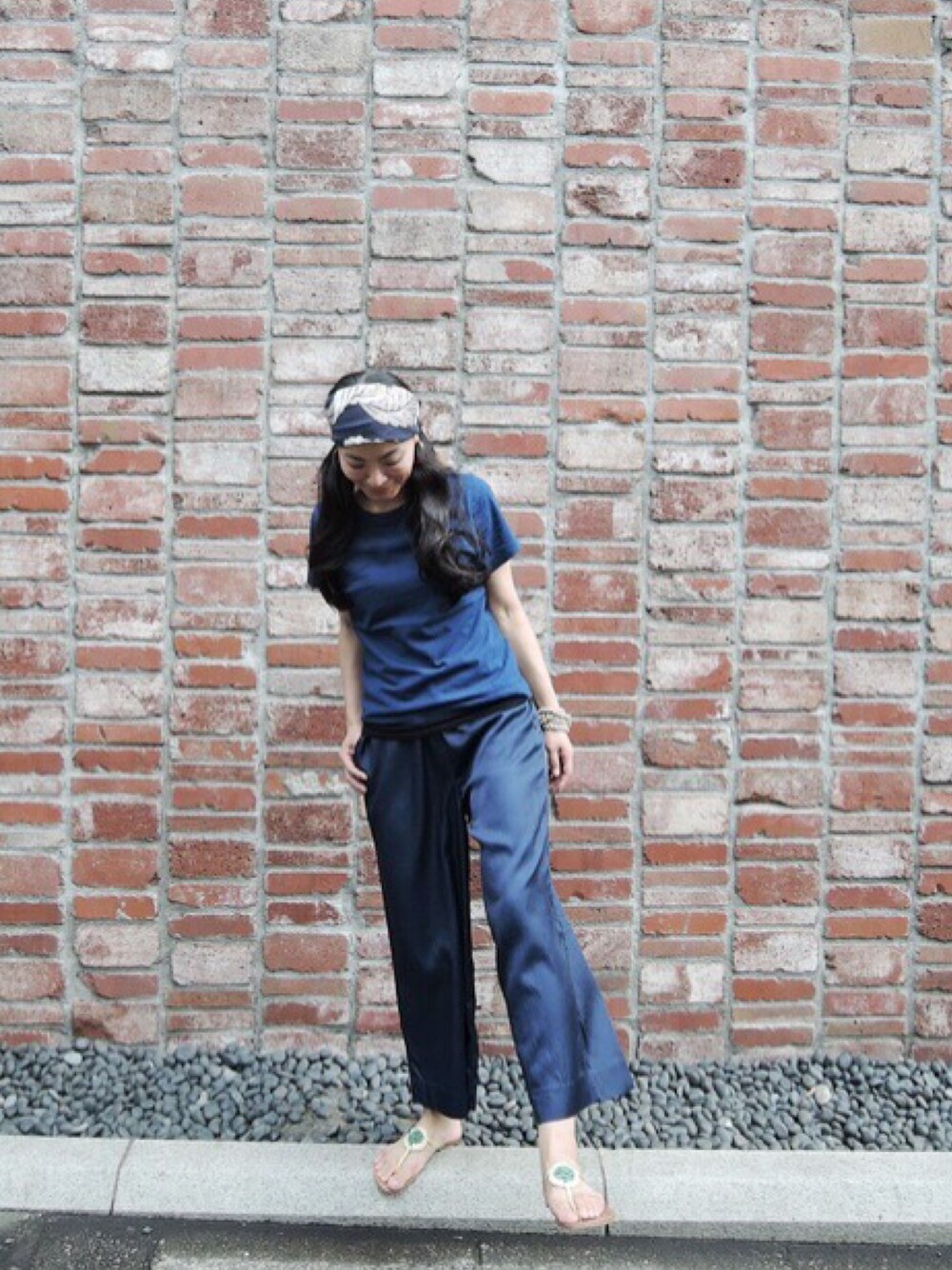 ALLネイビーのシンプルラクチンコーデ。 スタンダードのインディゴTシャツと 待ってた7月新作のサテンパンツです!✨
