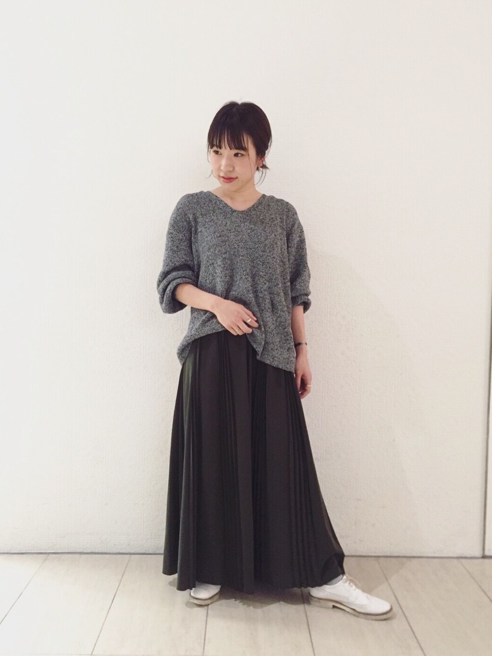 ステップを踏んだようなランダムなプリーツがはいったステッププリーツスカート。ざくっとルーズな畦のニットでリラックス感のあるコーディネートです✨