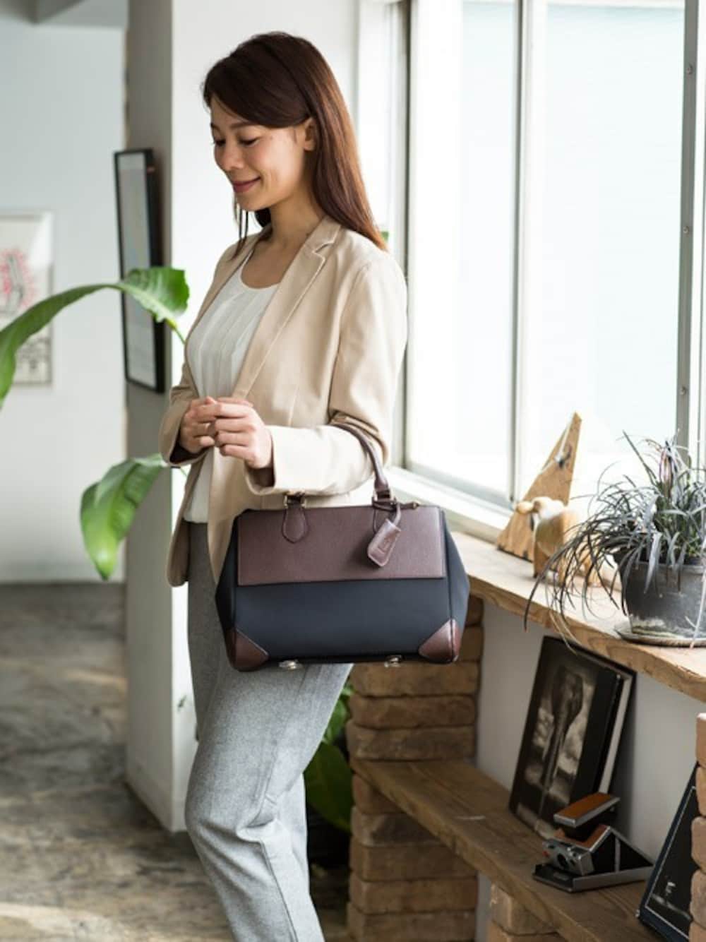 上品さと機能性を兼ね備えた しなやか素材のレディースバッグ。(日常通勤+出張に便利なA4対応サイズ) 出張などのビジネスシーンで活躍するレディースバッグを!そんなコンセプトで誕生したエラスティックトート。 本体ナイロン生地の間に、ダイビングスーツなどで使われるエラスティック素材を挟み、しなやかさ・クッション性が特徴。 牛革とナイロンのバイカラー仕上げで、ビジネスで活躍する女性に持っていただける上品で洗練されたデザインです。