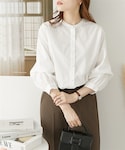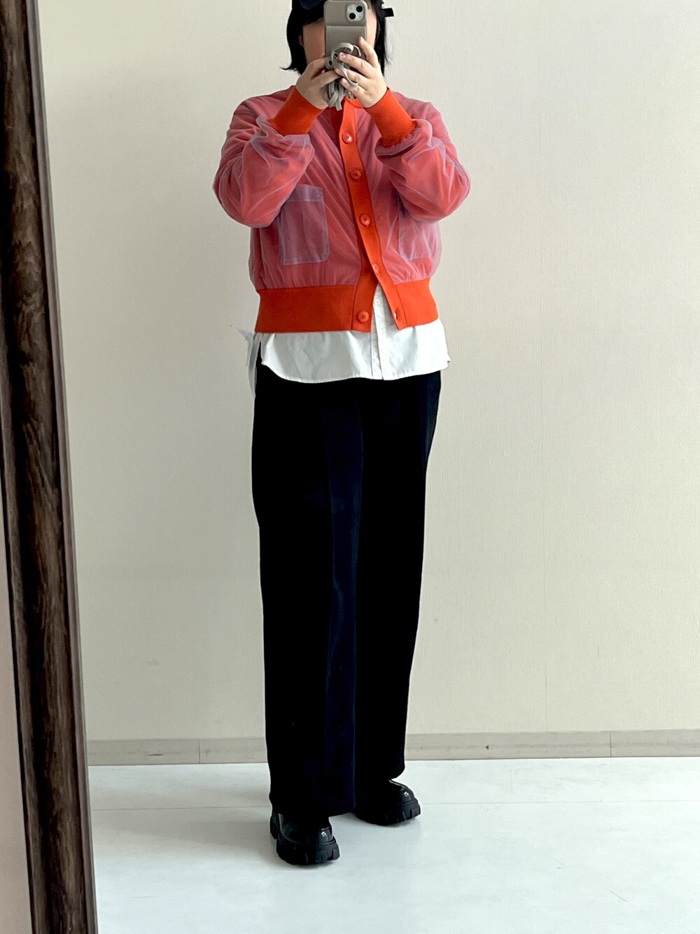 明るめカラーのニットカーデは前見頃にチュールが重ねてあるので、ニュアンスが素敵です。 白シャツ合わせで春らしく。厚底ローファーでスタイルアップもかなうかも?