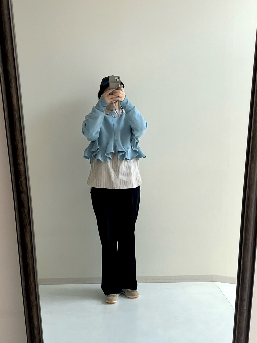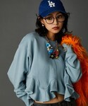 春色の短めスウェットにストライプシャツを合わせた春を感じるコーデ。スウェットは裾フリルが可愛らしいです。