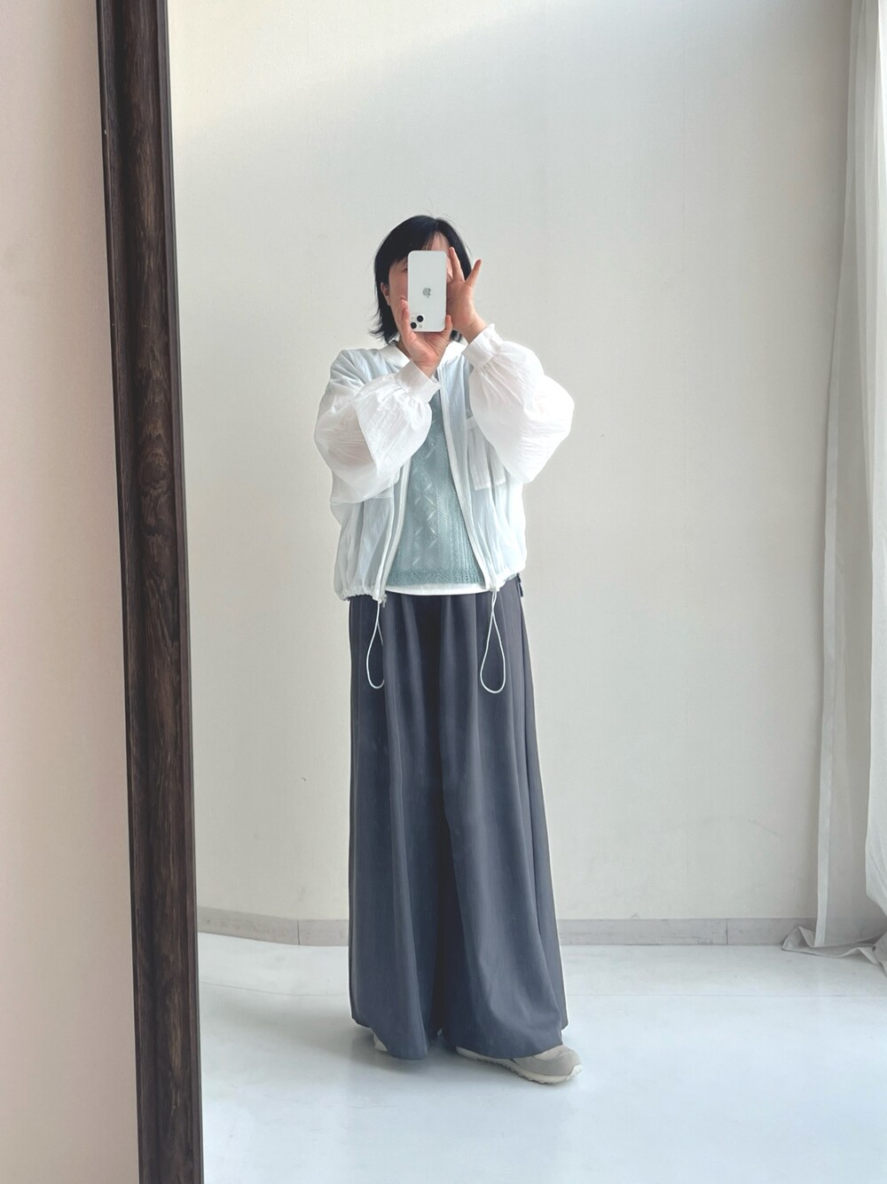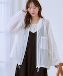 ゆったりシルエットのシアーブルゾンと緩めボリュームパンツでゆるシルエットコーデ。どのアイテムもシワになりにくいから旅行にもぴったりです。